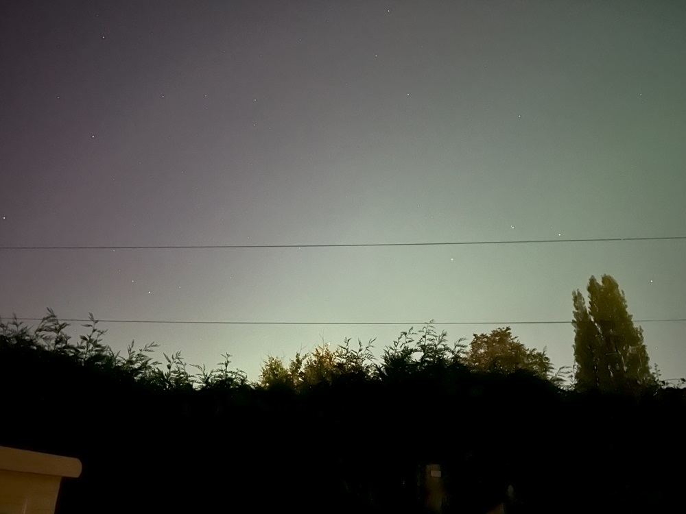 Finally - a glimpse of the Northern Lights from Stoke-on-Trent. Every time it happens, I miss it. Not the perfect picture but you can see the green on the right that fades to purple in the middle. The green caused by interactions of oxygen with electrons and the purple caused by the interactions of nitrogen with electrons.