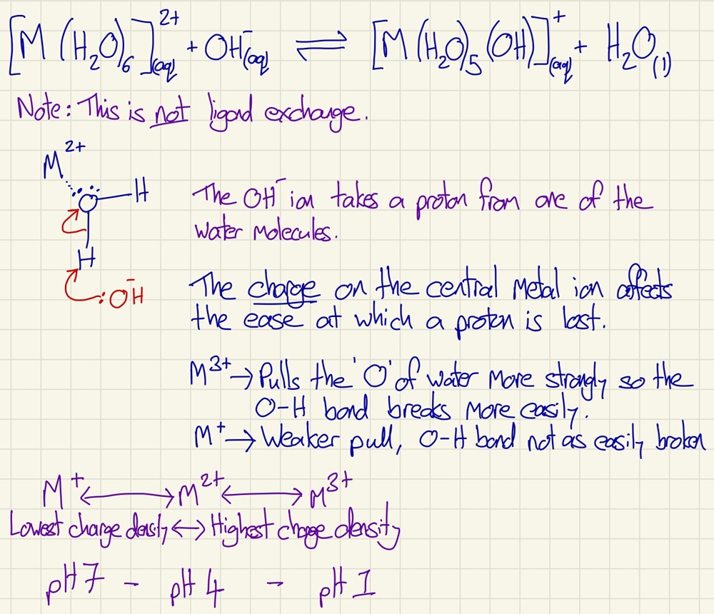 During an acid-base reaction, a proton is taken from one of the water ligands. It is very important that you note that this is not a substitution reaction/ligand exchange.