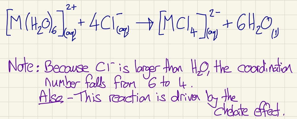 Finally, we will look at ligand exchange. These can change the coordination number which will affect the energy level change of falling electrons. This in turn affects the frequency of photons and so the colour that we see.