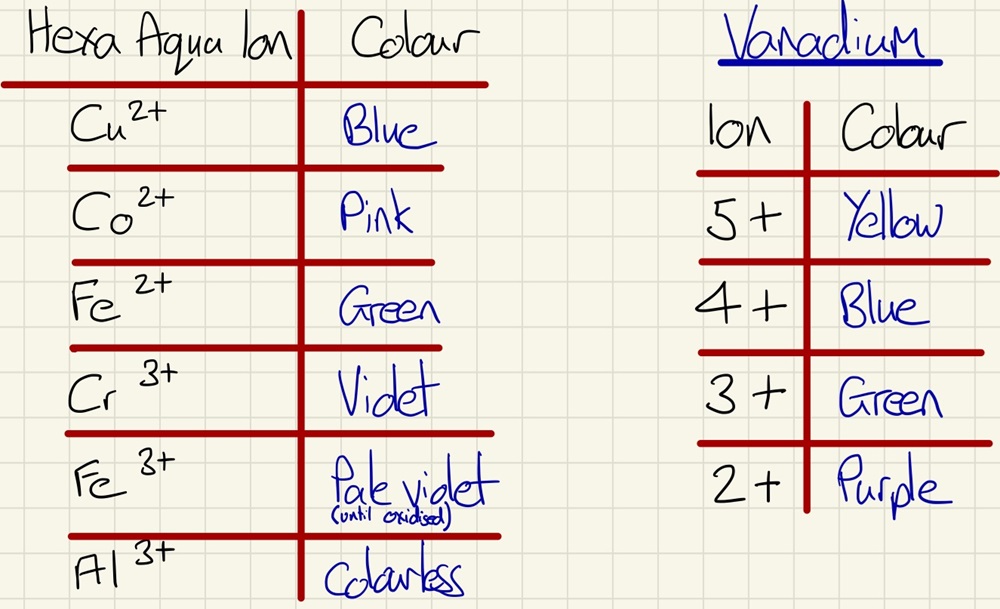 The second type will have the oxidation state of the central metal change. For example, Vanadium is yellow in the +5 oxidation state, blue in the +4, green in the +3 and purple in the +2. These changes can be seen when a solution of vanadate ions are shaken with zinc, the solution will transition from yellow through to purple.