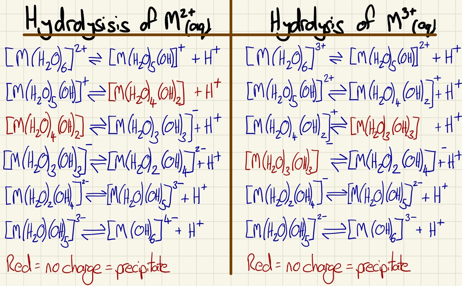 During an acid base reactions, a complex may lose a proton from one water molecule followed by one lost from a second and so on. As soon as the overall change of the complex reaches zero, the complex will precipitate out of solution. In certain cases, the complex will dissolve again if further acid-base reactions give it a positive or negative charge.