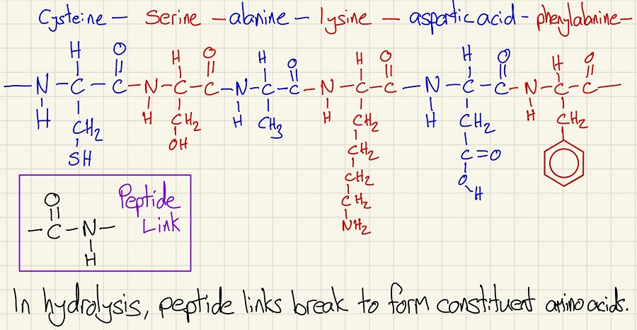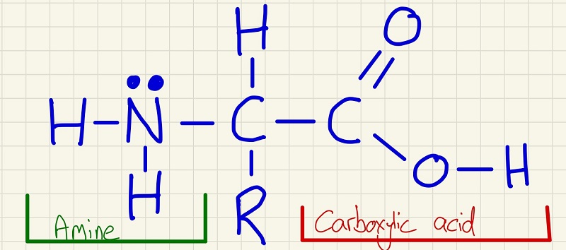 We start with amino acids. These were first met in GCSE biology but now we can identify them as chemicals with two specific functional groups. Each molecule must have an amine group (-NH2) at one side and a carboxylic acid at the other (-COOH). We know that these are the building blocks for more complicated molecules (polymers) and structures like proteins and enzymes. During a condensation reaction, a hydrogen from the amine group and the OH from the carboxylic acid break away (condensation polymerisation) and the two monomers join. As with any polymer, the monomers change the properties of the polymer. Here, the specific amino acids in a specific order make a specific chain/protein.