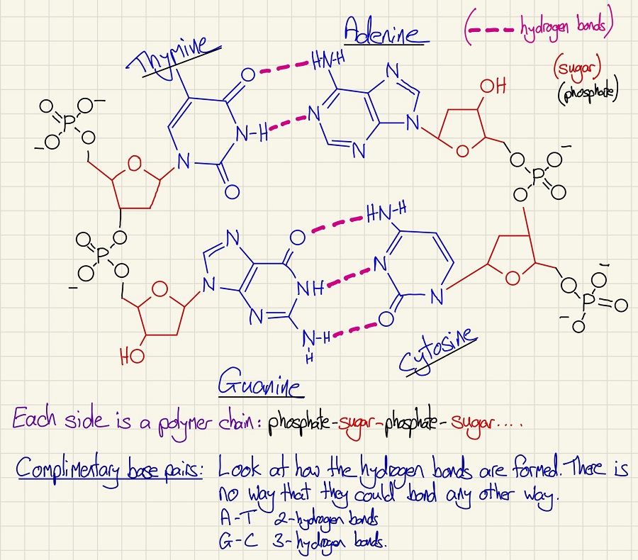 The backbone of DNA is a polymer with the repeating unit of phosphate-sugar-phosphate-sugar. On each sugar, a base is bonded to it. The 4 bases are adenine (2 hydrogen bonds), thymine (2 hydrogen bonds), guanine (3 hydrogen bonds) and cytosine (3 hydrogen bonds). These bases will only pair up with the corresponding pair (G-C or A-T) because they have to have the corresponding structure to form hydrogen bonds.