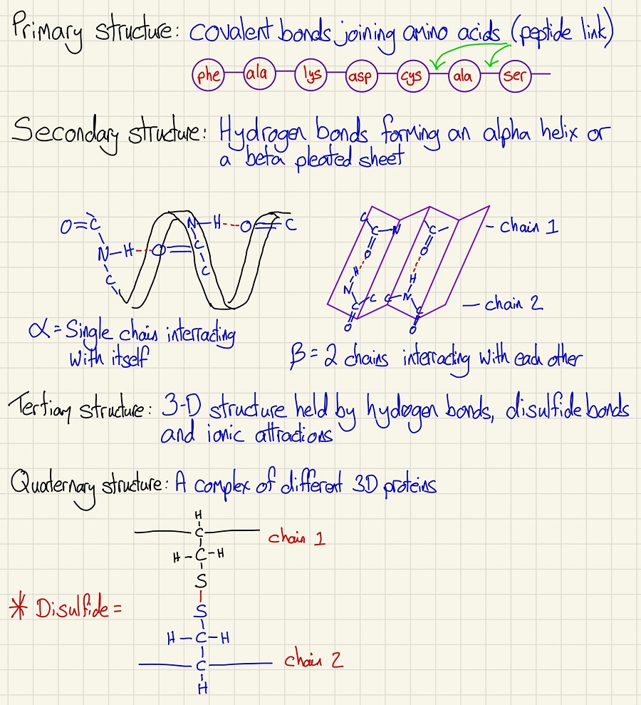 • Secondary structures are an alpha-helix or a beta-sheet, these are caused by hydrogen bonds between the different amino acids in the chain.