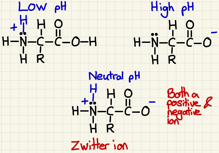 The amino acids behave very differently at different pH levels because the amine acts as a base so will accept a proton when the pH is low and the carboxylic acid will release its proton when the pH is high. At a neutral pH, a zwitter ion is formed, this is when the proton has left the carboxylic acid and is now attached to the lone pair or electrons on the nitrogen. This is a very special ion as it is both positive and negative at this specific pH.