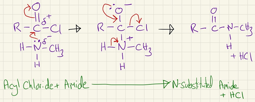 This is the mechanism for the reaction of an acyl chloride with an amide: