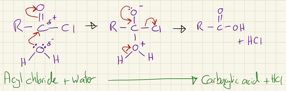 We next turn to Acyl Chlorides. These react in a similar way to other carbonyl compounds, however, they are much more reactive due to the electronegative chlorine attached to the carbon atom. This means that they will not require the same temperatures, in fact, you may use some of these (carefully) in lab practicals and they will happen at room temperature.