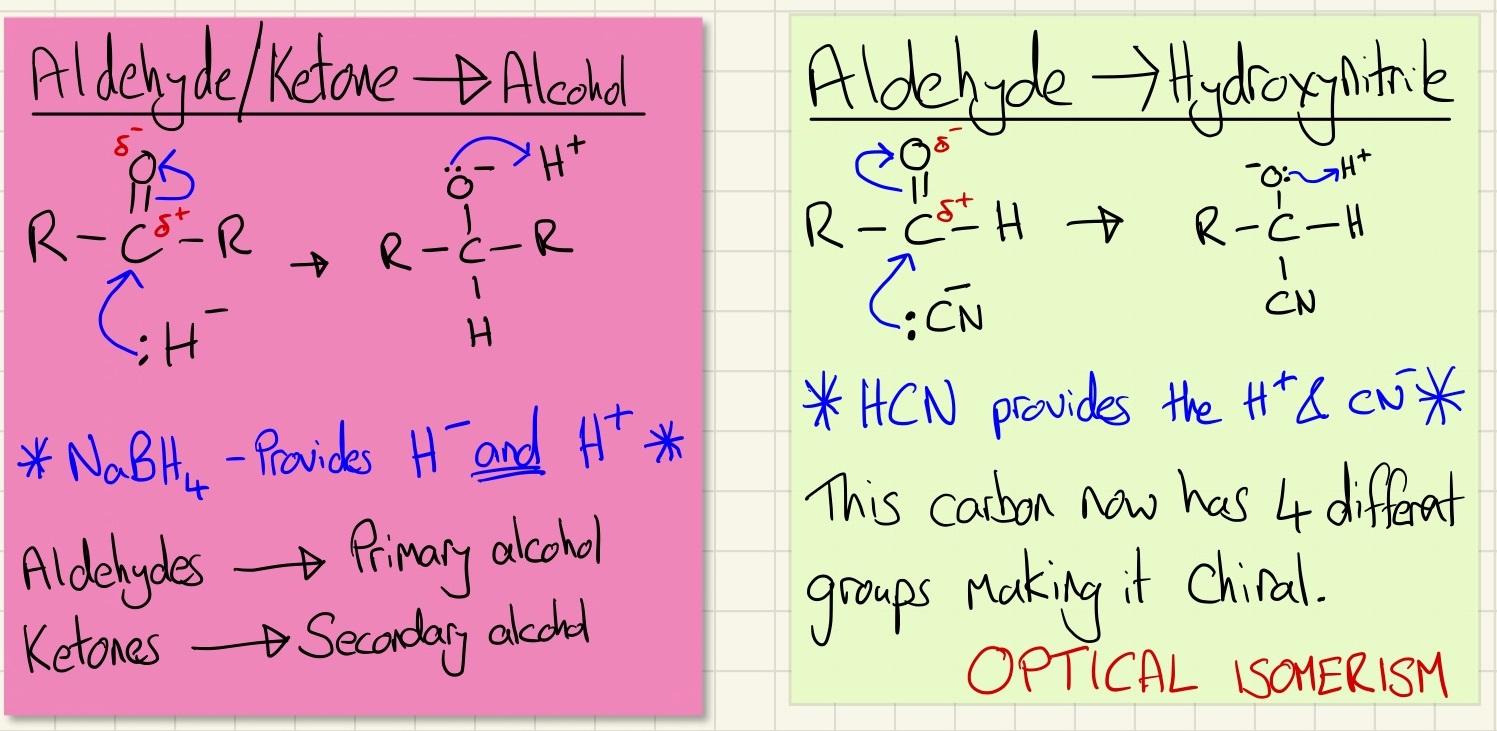 Next, we need to look in detail at their reaction mechanisms. Here there are two and you can see the reduction using NaBH4. This is often shown in reactions as [H] as it provides firstly a negative hydrogen ion to attack the delta positive carbon, then a positive hydrogen ion to add onto the negative oxygen. The second mechanism produces a new molecule type called a hydroxy nitrile. As well as understanding this mechanism, be very aware that we are now producing a potentially chiral molecule and, by adding the CN group, we have extended the aliphatic chain.