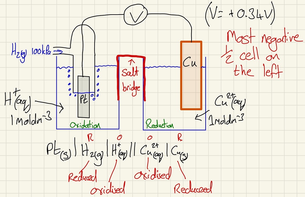 The electrochemical series is a way of showing reactivity in a quantitative way. Every redox half equation can be given a half cell potential. These are achieved by setting up an electrochemical cell against a standard hydrogen electrode. In this standard, we have a platinum electrode (chosen because it is the conductive interface but is so unreactive that it has no effect on the EMF of the cell) in a 1 moldm-3 of H+ ions with H2 gas being bubbled up through the solution onto the electrode at 100 kPa.