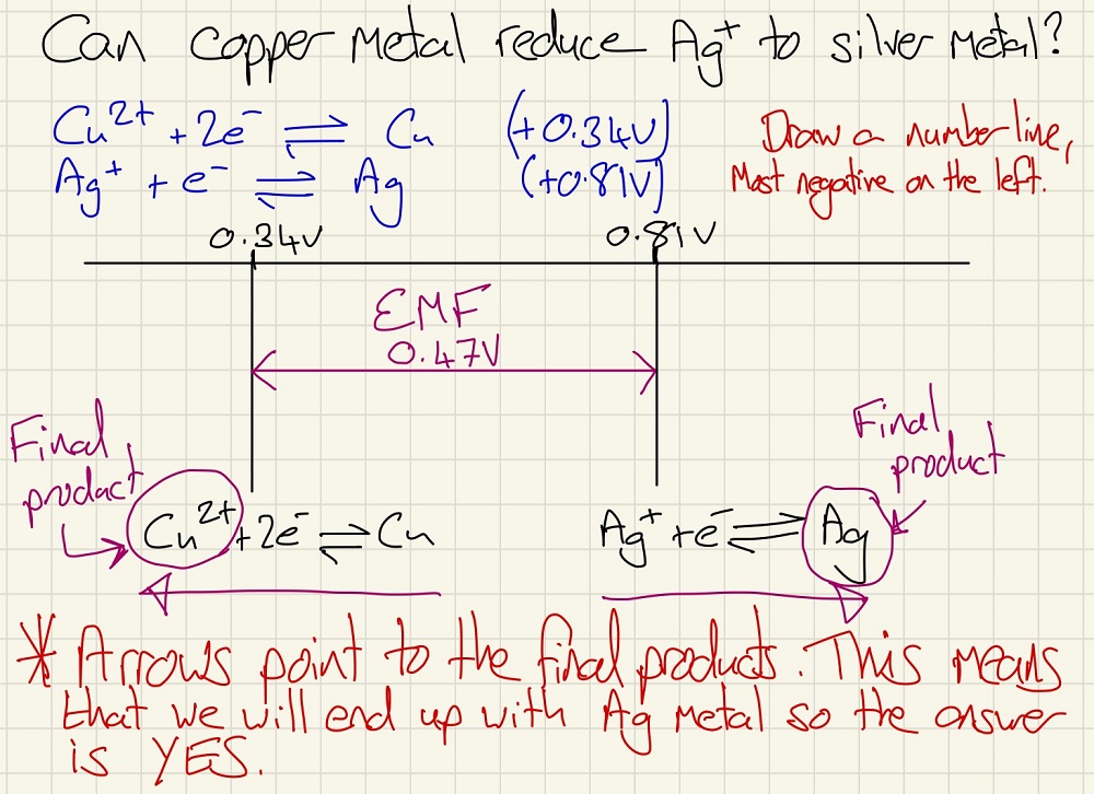 Another use for this data is to see if a reaction will take place. If you add your half equations to a number line, as shown below, you can firstly work out the cell EMF. Secondly, be drawing the arrows moving from the centre outwards, you can see what the final products will be if they were mixed. You may be asked if one species can oxidise or reduce another, this is the perfect way to work this out.
