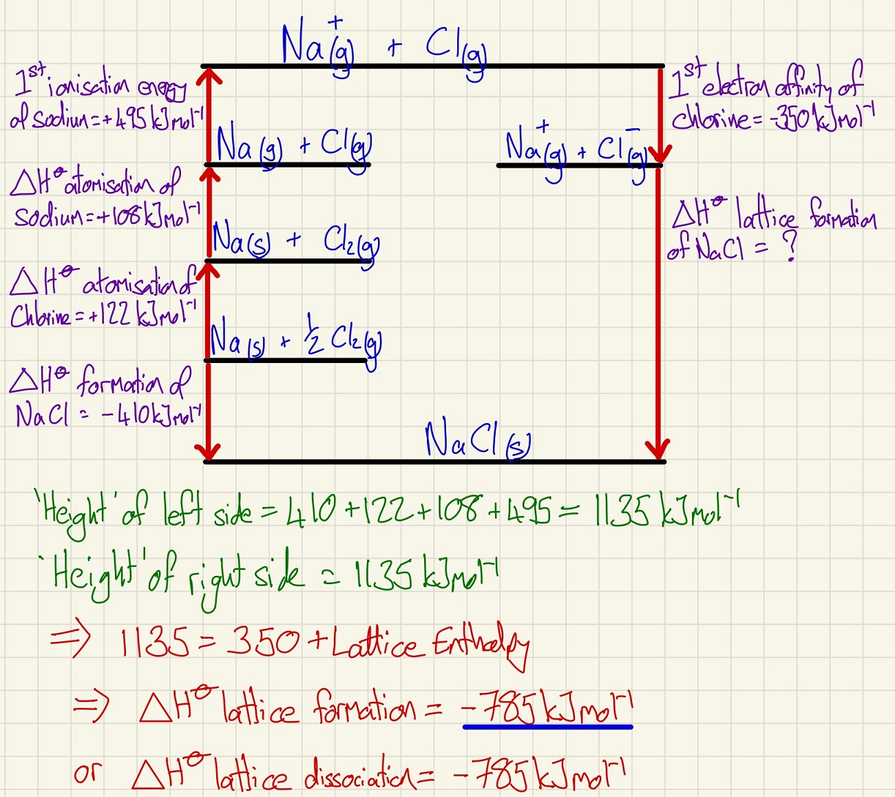 We start this topic by looking at the wonderful Born Haber cycles. This builds on form our work on Hess's law, we construct a more complicated cycle but in the shape of a tall building. If we know the height (energy change) on one side, the other side has the same height. If one piece is missing, we can work it out on this basis. Exothermic processes move up, endothermic processes move down. Look carefully at the example below. Be really careful of the values that you use, for example, if it is MgCl2. then you will need to atomise chlorine and get 2 moles of Cl, then you need 2 lots of the first electron affinity of chlorine.