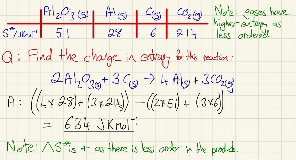 Entropy is simply a measure of disorder. Highly disordered substances (gases) have high entropy and ordered substances (metals) have low entropy. Find the total entropy of the products and take the total entropy of the reactants.