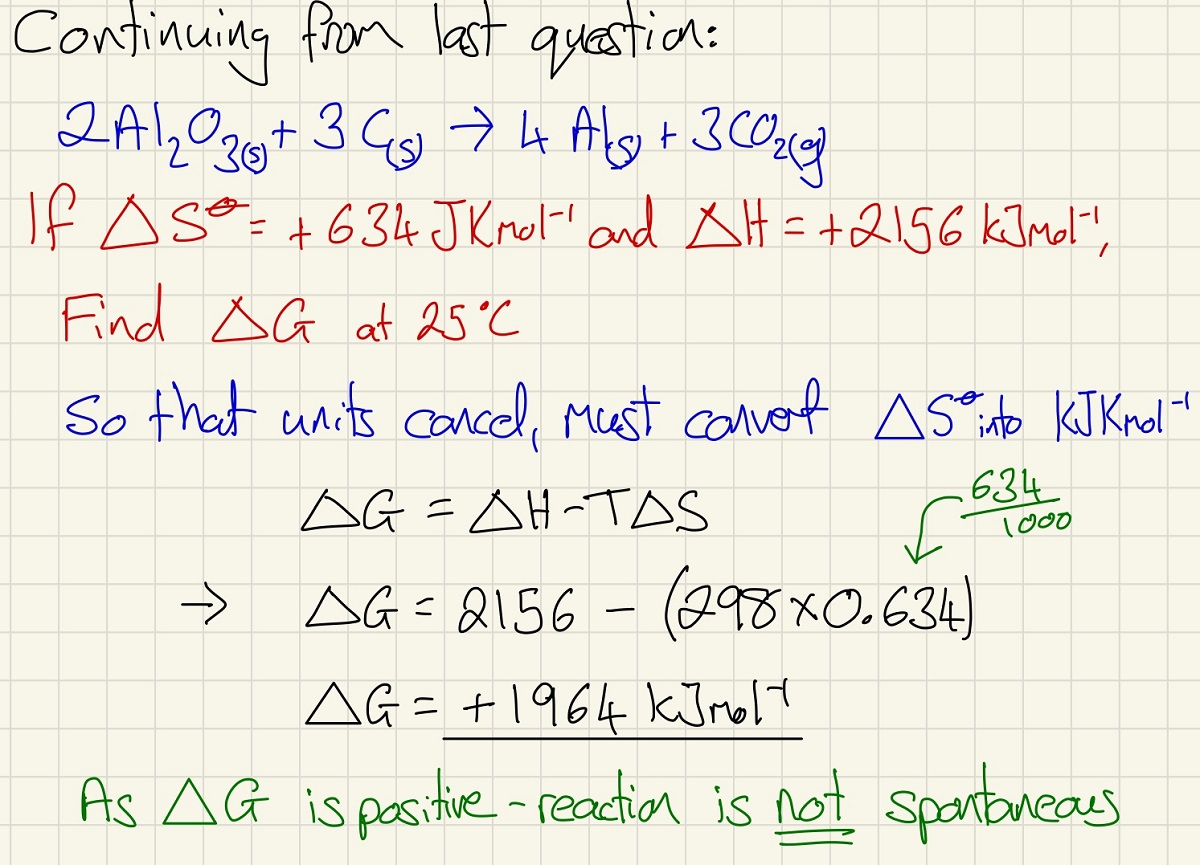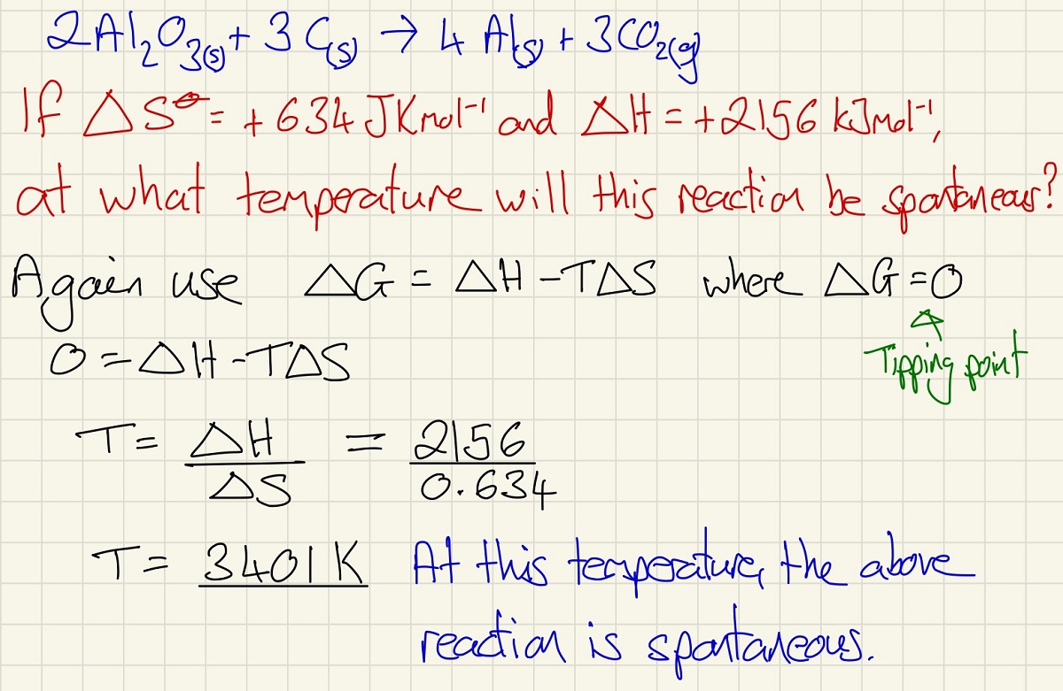 Gibbs free energy amalgamates entropy and enthalpy to see if a reaction is feasible. If the outcome of the equation is positive, the reaction is not feasible and if it is negative, it should be spontaneous at that temperature.