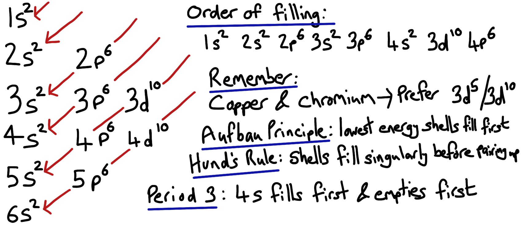 Give the full electronic configuration of any atom or ion using the s, p & d orbitals with a "Z number" of up to 36. You will also be able to construct equations for successive ionisation energies and explain trends across period 3 and down group 2