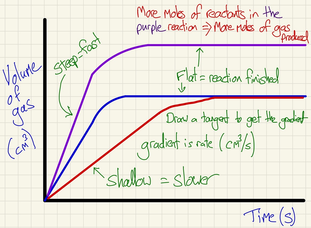 We can measure the rate of reaction (continuous method) by plotting the volume of a gas evolved against the time as shown below. These graphs are simple but show lots of information. By drawing a tangent at different points, you can get the gradient and so the rate. You will be able to see that the rate always falls over time, this is because with time, reactants are used up and so the concentration falls, so does the rate as there are fewer (successful) collision per second. We stipulate "successful" collisions because if the particles do not have the activation energy or higher, they will not react. As well as the rate, you can see the final volume of gas, use PV=nRT to work out the moles of gas and can even see if there was a limiting reactant.
