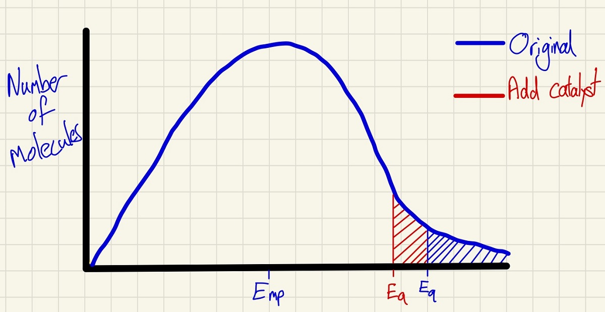 These curves also explain the effect of adding a catalyst. Crucially, the shape of the curve does not change at all which corrects many misconceptions. By moving the minimum energy required to successfully collide to a lower point, the shaded area shows that more molecules have the activation energy so there will be more successful collisions per second and so a higher rate.
