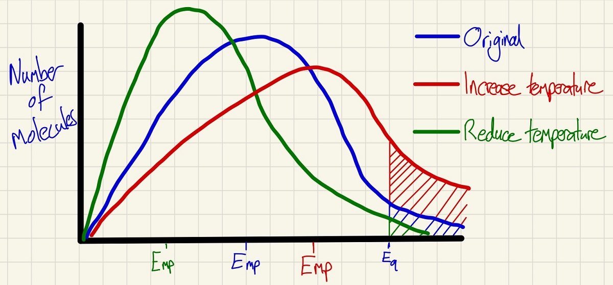 The Maxwell-Boltzmann distribution curves show the amount of (kinetic) energy that molecules in a closed system have. The curve shows you the Emp or Energy most probable and the Ea Activation energy. Only the molecules above the activation energy will have a successful collision and react if they collide with the other reactant molecule type. These curves are a great way to show the effects of changing the temperature and to explain how this affects the rate. In particular, note the shaded areas which clearly show that as the temperature increases, more particles have the activation energy and by cooling it down, far fewer have it and so the numbers of successful collisions per second can be explained clearly.