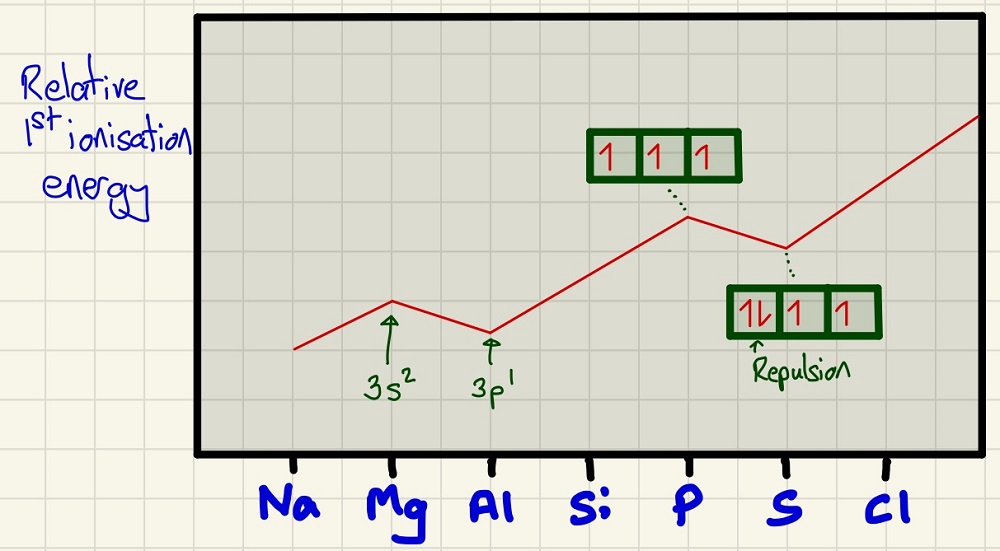 The first ionisation energy (the enthalpy change to remove 1 electron from each of 1 mole of gaseous atoms). Generally, it increases as, stated above, there are more protons so more attraction as you move to the right. There are 2 distinct anomalies, firstly, the dip from Mg to Al is because the Al electron is coming from the empty "P orbital" whereas the Mg one came from the "S Orbital". The second one is causes by having 2 electrons in the same orbital in S which adds some repulsion so one is "helping" to push one out when we are trying to remove it