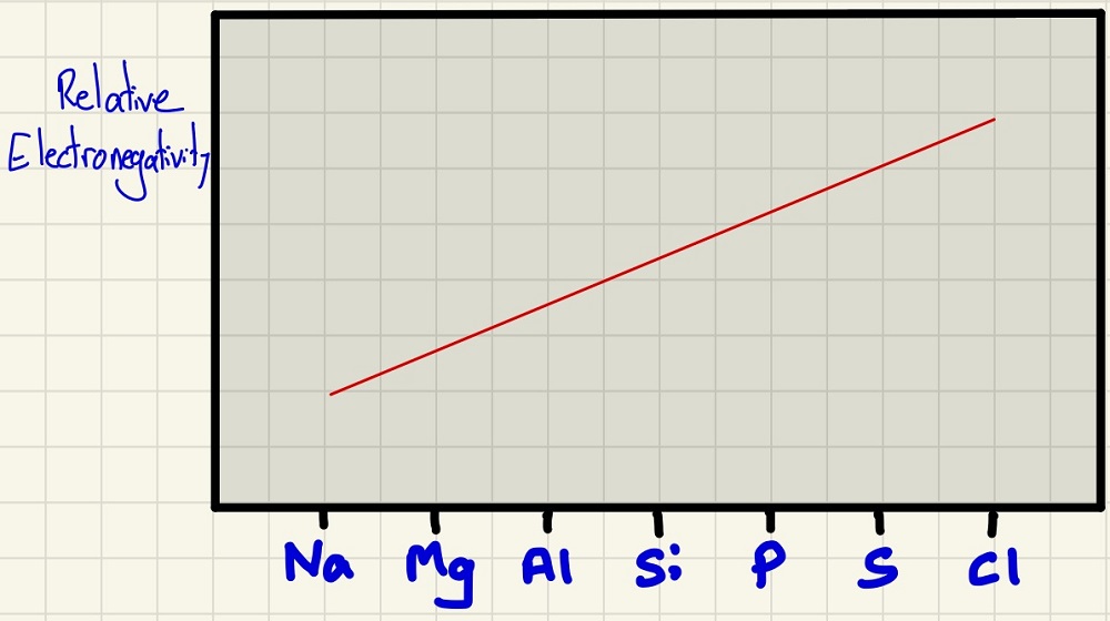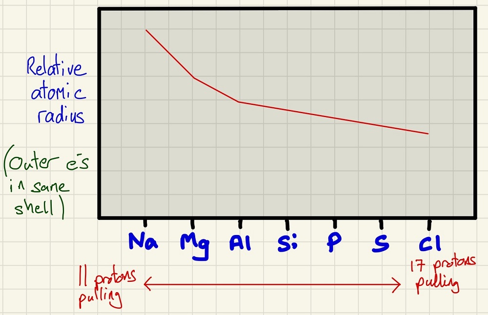 Below is the trend in atomic radius as you move across period 3 from Sodium to Chlorine. The trend is simply that as you move right across the period, the radius decreases. You need to be able to explain this (and understanding is even better), every time you move one element to the right, you add a proton which creates a stronger attraction to the outer electrons. All of the outer electrons are in the same shell so they are pulled in a little closer each time.