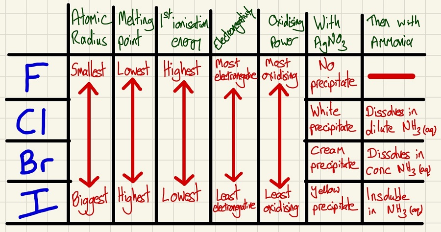 REDOX relationship: Fluorine can displace chloride, bromide or iodide ions. Chlorine can displace bromide or iodide ions. Bromine can only displace iodide ions and iodide cannot displace any. Fluorine is the most powerful oxidising agent, iodine is the weakest. The inverse is also true, I- is the most powerful reducing agent and F- is the weakest.