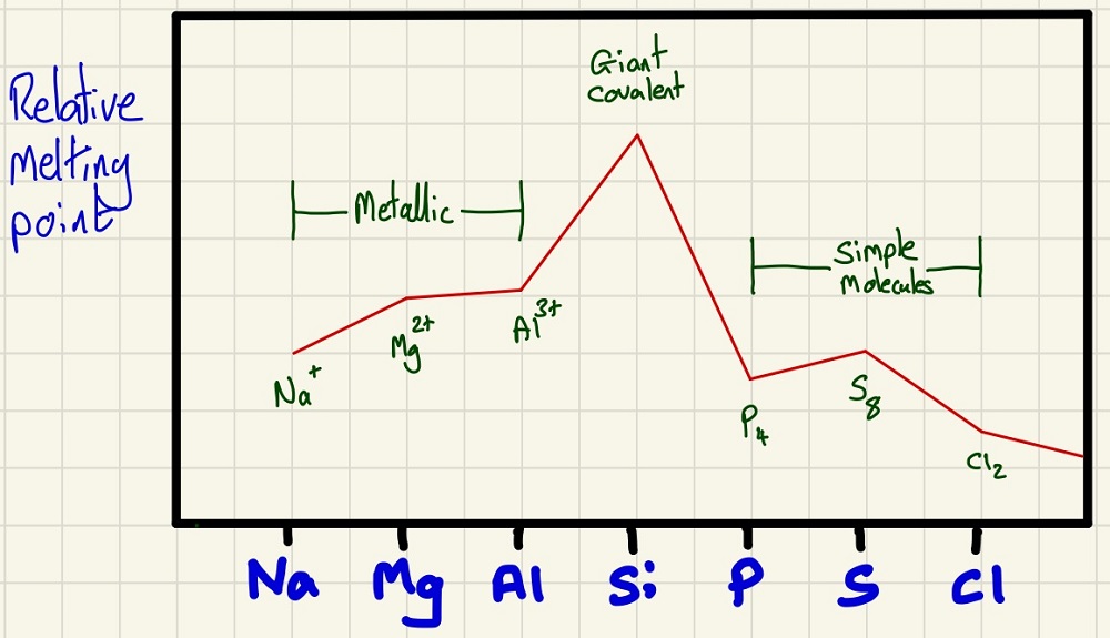 The melting points are very closely linked to the structures of the elements. Na-Al are metals so have metallic bonds, as their charge increases, so does their attraction to the delocalised electrons around them. Si is giant molecular so has the enormous 3D lattice. The last three are all simple molecules to their intermolecular forces are Van der Waals' forces and are proportional to size. Here we need to know that P4 has less mass than S8 which is why it climbs for S. Finally, the lowest mass if for Cl2.