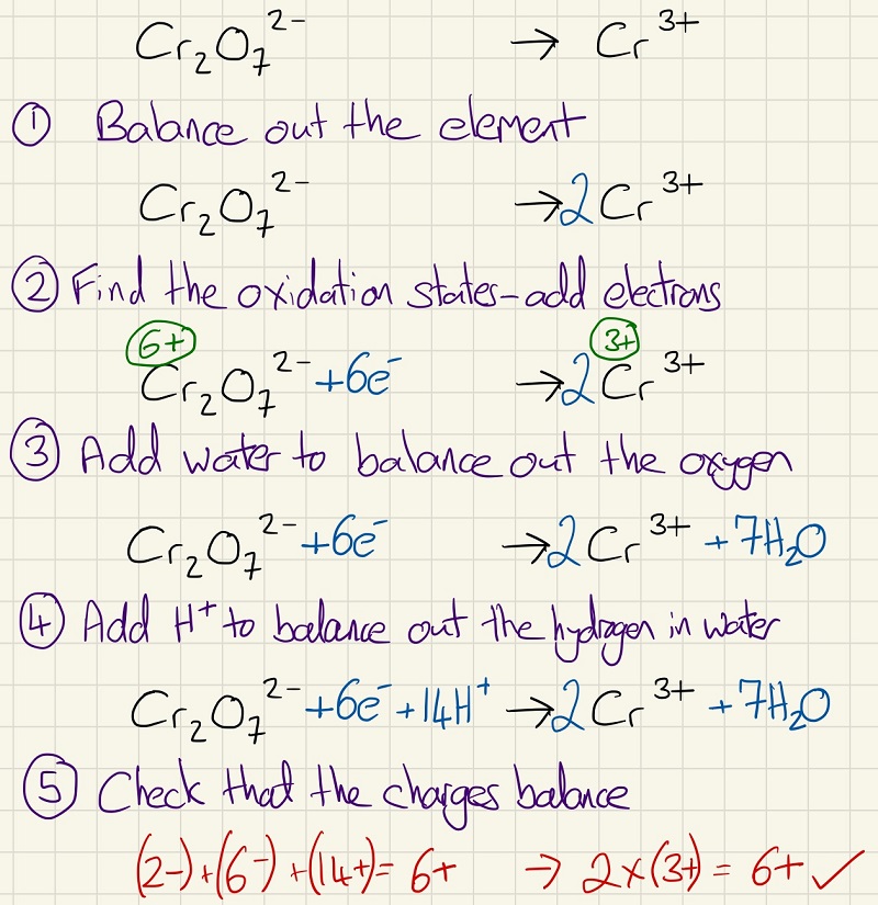 REDOX changes that involve ions containing oxygen are balanced in acidic conditions and it is essential that you follow the steps below and always check at the end that the charges balance.