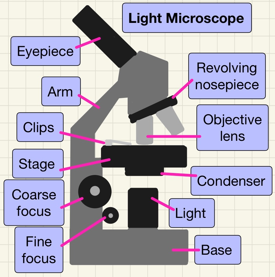 In school, you need to be familiar with using a light microscope. You should complete the required practical. Magnification can be worked out by adding the magnification of the two lenses on the microscope. If there is a x10 lens and then the x4 lens, the overall magnification is x40. We can then use this formula to work out the real size of cells under the microscope: