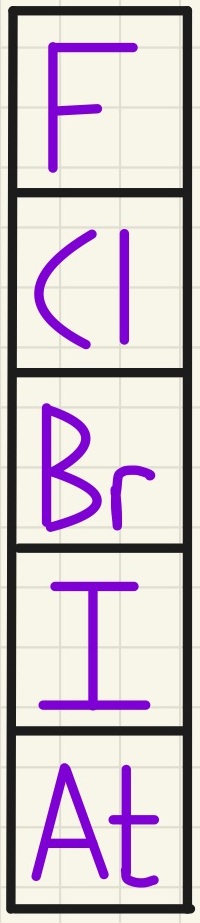 The halogens are all non-metals and all have 7 electrons in their outer shell. This causes them to have similar chemical properties as they each need to gain one more electron. You will learn later how they bond with each other in a covalent manner, and form diatomic molecules such as F2, Cl2, Br2 and I2. We do not concern ourselves with the chemistry of astatine as there is so little on the planet (approximately 1g in the entire crust at any time), but we know that it will follow these patterns.