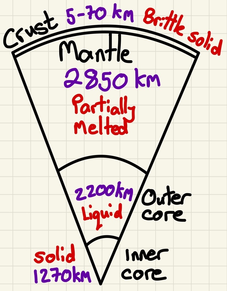 Draw a scale cross-sectional diagram of the Earth and label all the sections correctly.