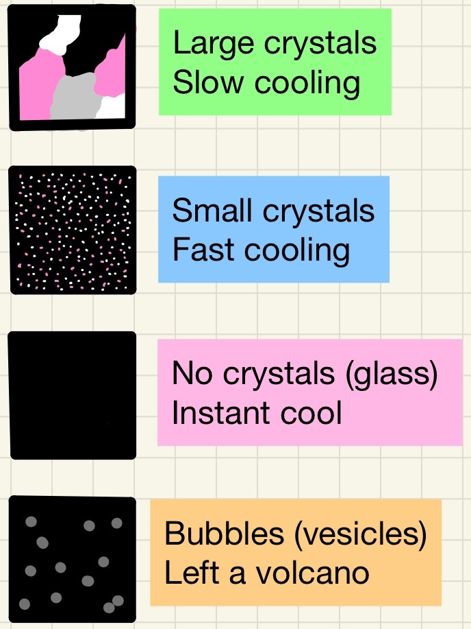 Igneous rocks are often the most exciting as they make us think about volcanoes and disaster movies. This is true, some igneous rocks come from volcanoes, but not all. Igneous rocks are made from crystals that are interlocking. Their crystal size varies and this tells us lots about how they were formed. Igneous rocks have lots of carbon dioxide dissolved in them when they are melted (remember this for future lessons). When magma (liquid rock below the surface) reaches the surface, it becomes lava. If the lava touches the air, the carbon dioxide bubbles out as the pressure is released (just like when you take the lid off a pop bottle) which will give the rock lots of little holes. If the lava cools quickly, it will have little crystals, if it touches water and cools very very quickly, it will have no crystals so becomes a glass like obsidian. Some magma never gets to the surface and cools very slowly over hundreds of years or longer, these samples will have very large crystals. Today, we can use the size of crystals and the presence or absence of gas bubbles to tell a lot about the environment in which the rock formed.