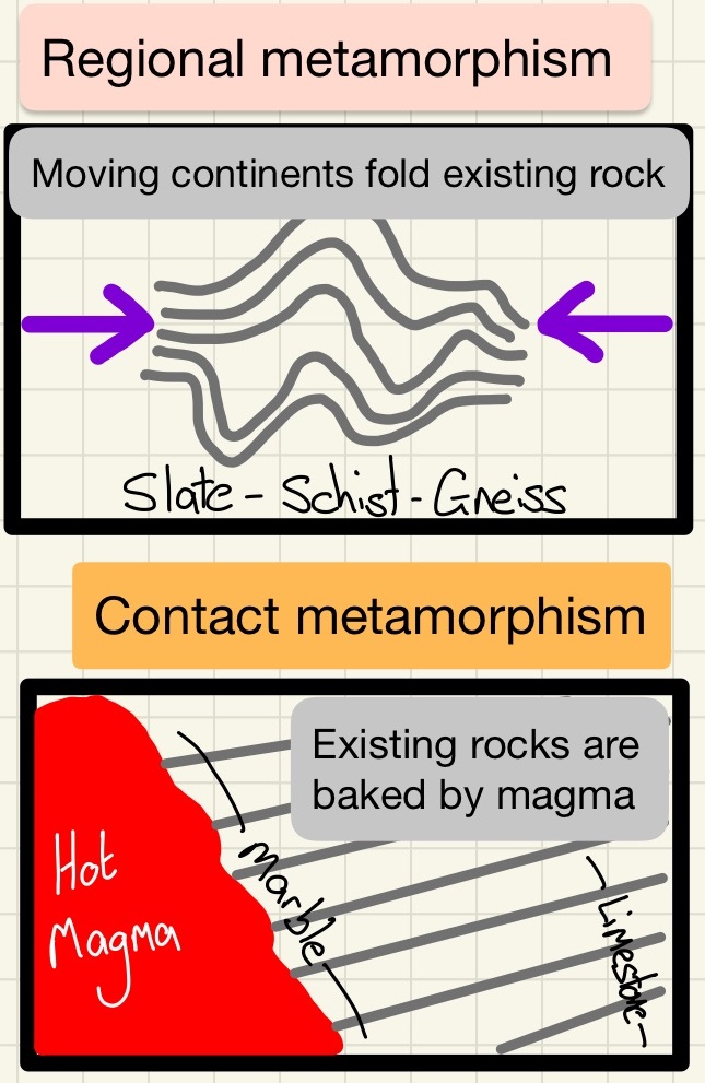 The final type of rock is the metamorphic rock. This is simply an existing rock (sedimentary or igneous) that has been changed by an outside process. The first is contact metamorphism in which a chamber of magma is formed next to existing rocks and the heat literally bakes it. The second is regional metamorphism, this is when plates are moving nearby and huge amounts of pressure crush, twist, lift or bury existing rock and cause it to be changed.