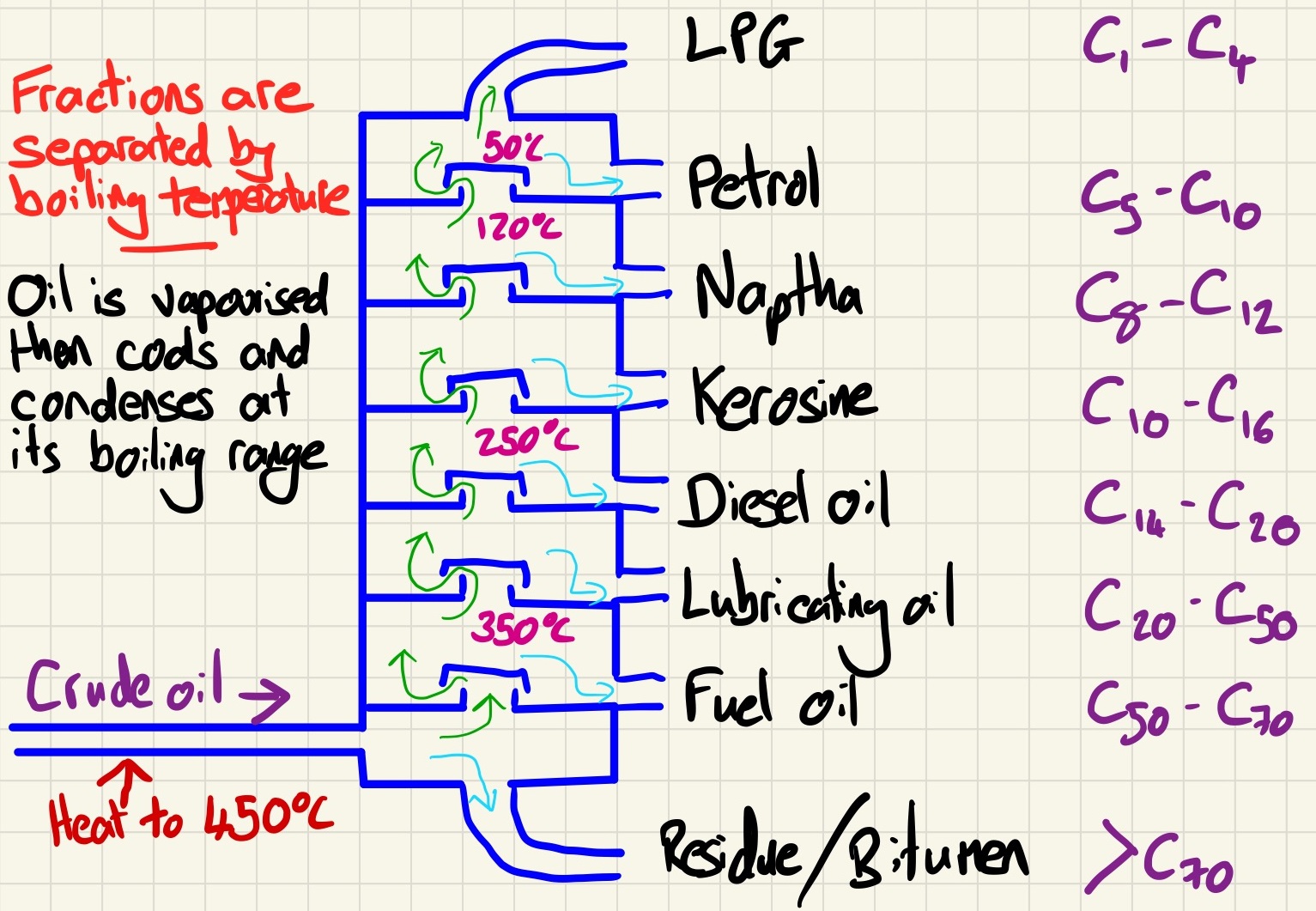 Crude oil is a useless substance on its own. It must first be separated into different fractions. Remember that a fraction is not a single compound, instead, it is a collection of alkanes that have a similar boiling point and so a similar chain length. The process is fairly simple but you must remember to use the key vocabulary for each stage.