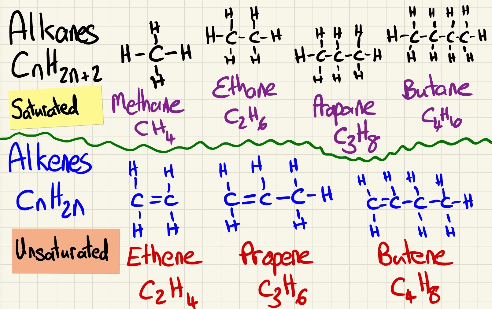 Alkanes and alkenes are examples of hydrocarbons, you need to know the names of the first 4 alkanes and show their formula. e.g. ethane is C2H6.