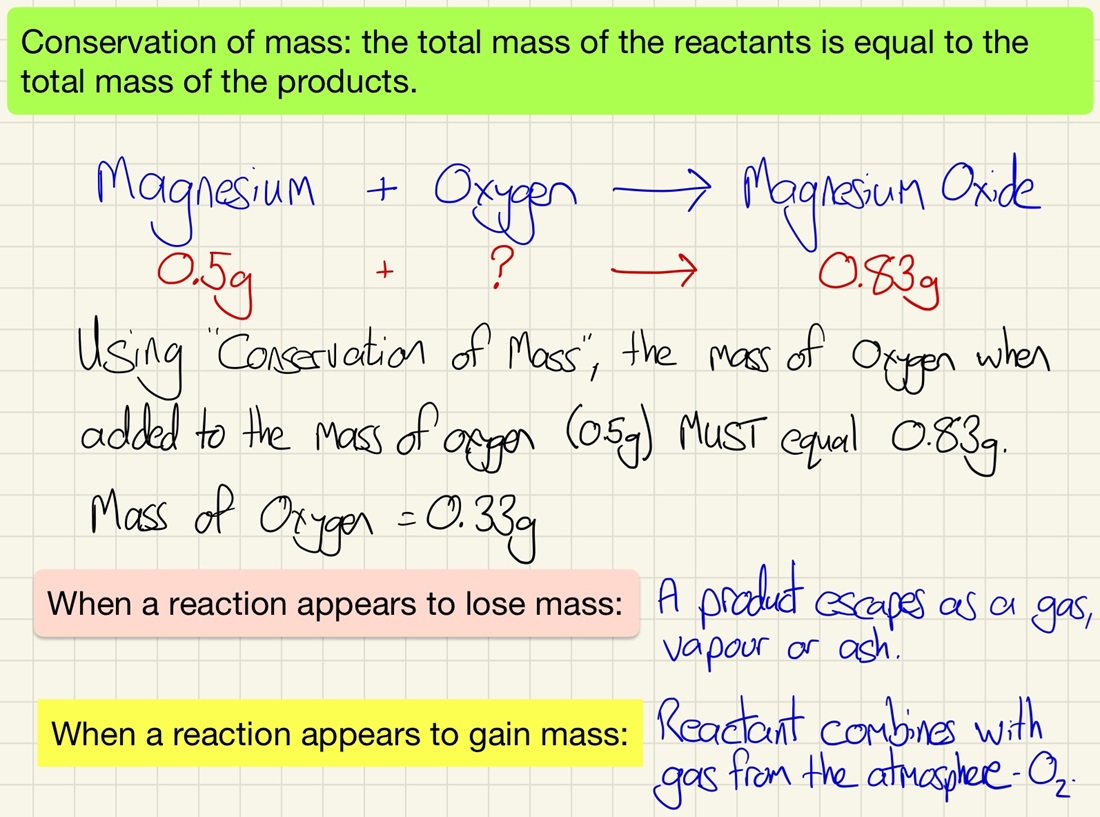 The law of "conservation of mass" states that the total mass at the start of a reaction is the same as the mass after - not atoms are gained or lost.
