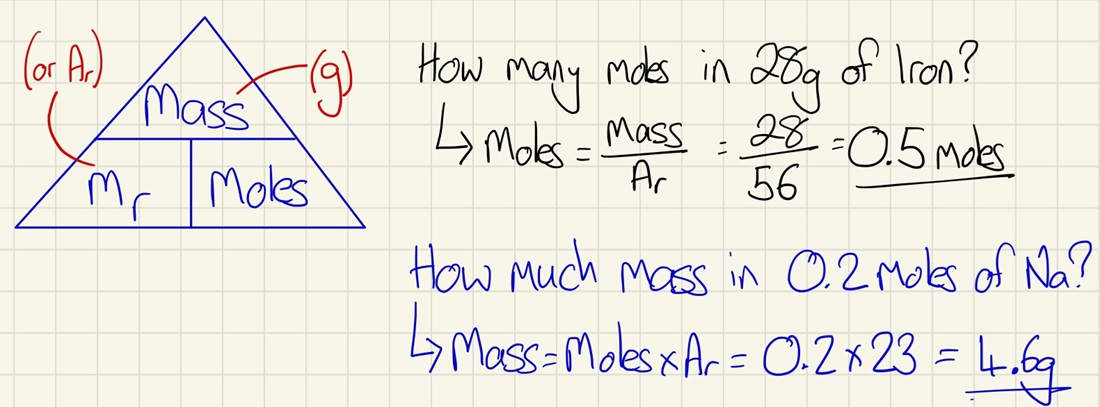 Don't be frightened! Just use the triangle in the picture and you will be able to work out the number of moles in a substance and also use the number of moles to calculate the mass.