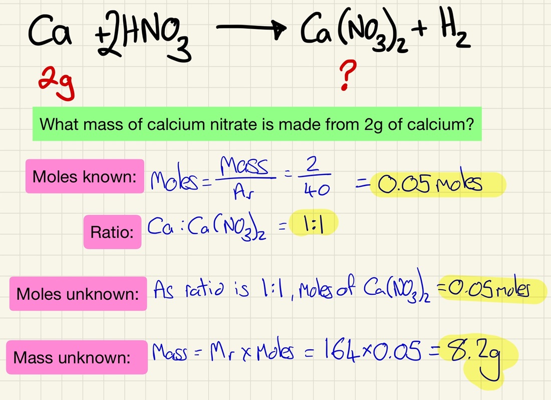 Using balanced symbol equations, calculate the mass of a product or reactant using the mass of one that is known (reacting masses). Need to be able to apply ratios here too.