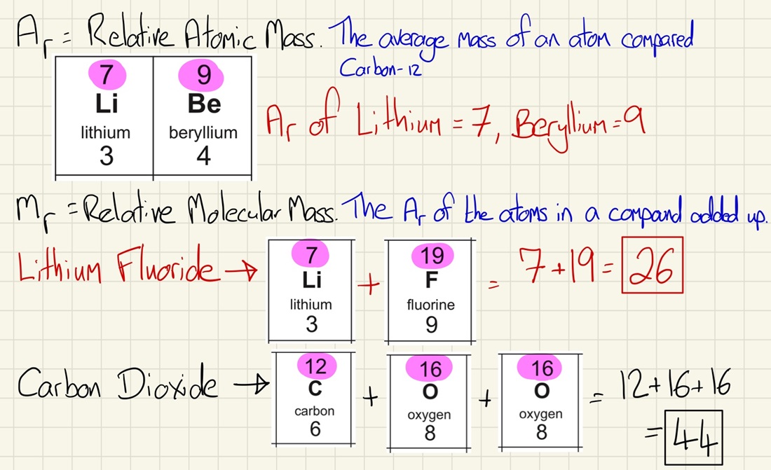 By adding the Ar (relative atomic mass) of atoms in a compound, you can work out the Mr (relative formula mass). You can calculate the percentage mass of an element in a compound and use this to calculate what mass of an element there is in a known mass of a substance.