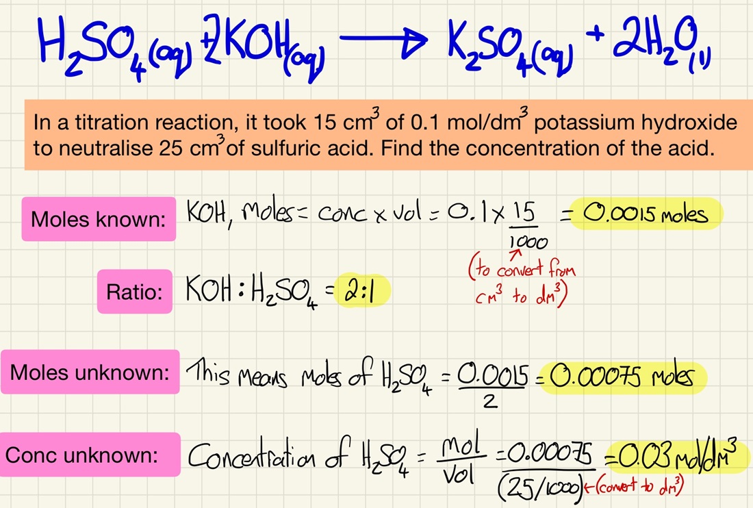 Here is the most challenging, and so the most rewarding part of quantitative chemistry. By reacting an acid of known concentration with an alkali of unknown concentration you can find out its concentration using mole calculations. A titration is an accurate way to measure a precise end point of a neutralisation. Follow the steps in my worked example and practice them over and over again.