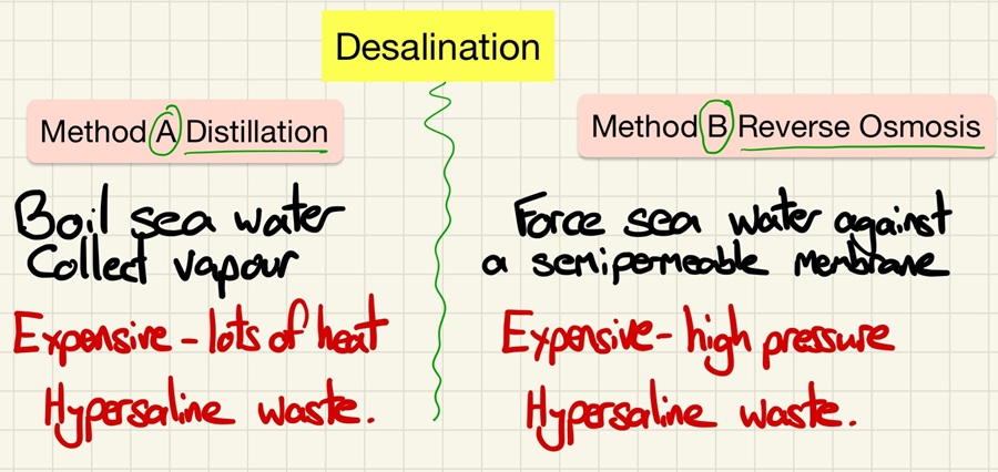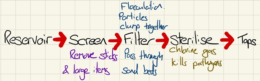 You need to be able to describe these stages and state why each one is competed. In countries that do not have our rainfall levels, desalination (removing salt) is an option. Here, fresh water is taken from sea water in the expensive process of wither distillation or reverse osmosis.
