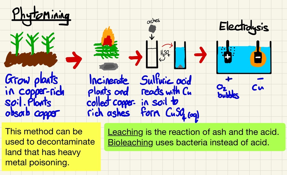 Metals are a finite resource and we finding it harder and harder to find high yield deposits. We are currently mining and quarrying deposits that we would not have even thought of exploring 100 years ago. Copper is our best example, we are more and more reliant on our electrical devices and all power cables and most water pipes rely on this metal. In order to get more copper, we have moved from traditional mining and reduction techniques to phytomining. This is an ingenious method in which plants are grown over soil that is rich in copper. The plants are then harvested and burned. The ashes can then have the more concentrated copper extracted. Bioleaching is when bacteria react with the low grade ore and produce a leachate which can be treated and have the copper extracted. If the ashes etc are reacted with sulfuric acid then the resulting copper sulfate can be electrolysed.