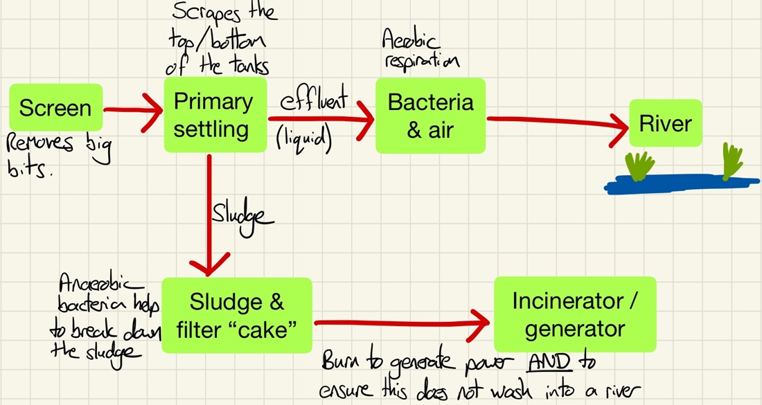 When the potable water leaves homes, schools, businesses, factories and farms, it it far from drinkable. Wastewater will contain "solid organic matter" (a polite way of saying poo) and bacteria that can cause serious illnesses and we do not want to return to the days of cholera. When sewage arrives at the sewage treatment plants, it once again begins with the process of screening. This time, however, the matter that is screened off has to be incinerated because of the bacteria content. The sewage then goes into large tanks and the sludge that sinks to the bottom or floats to the top is scraped off and undergoes anaerobic digestion before being incinerated. The remaining water is called effluent and this has air bubbled through it to promote aerobic digestion of any remaining matter. When this is complete, the effluent can be sent into rivers.