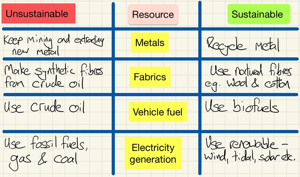 Finally, you need to be able to show ways of reducing the use of resources. Starting with Reduce, Reuse and Recycle. Look into a variety of materials like glass, ceramics, metals and plastics, see how they affect the environment from oil exploration to giant pen quarries. Given data, you need to be able to evaluate ways of reducing the use of our limited resources.