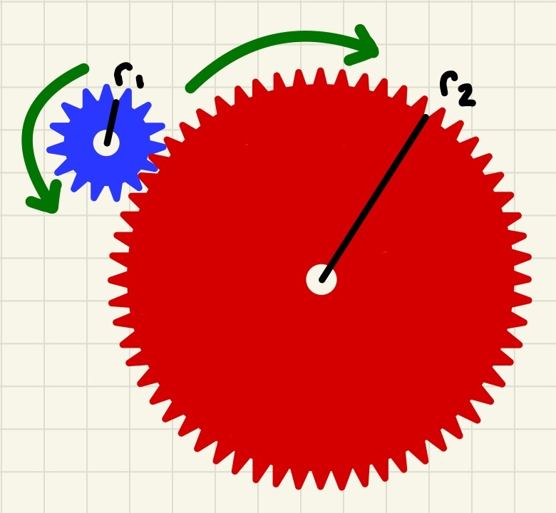 Gears is another example of everyday life being explained by physics. Why is it easier to peddle up hill in first gear on a bike? Why do I turn the can opener through lots of complete revolutions and it hardly moves around the can? By investigating the gears you will see the link between the ratio of numbers of teeth on a cog or the ratio of the circumferences and the rate of rotations. By applying what you have learned from levers in the previous topic, you can see that there are opportunities to "make something easier". This, like with levers can be called a force multiplier. As this is a turning force, we can use moments. Moment = Force x distance. With gears, distance is always the radius of the gear (shown as r1 and r2) as shown on the diagram.