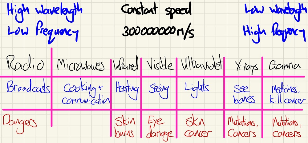 This section contains lots of facts that you need to learn. This table is a good start but you need to know about the uses of them all with specific examples, dangers to living tissue and other facts such as: oscillations in an electrical circuit generate radio waves and linking radiation doses from X-rays to Sieverts delivered so that you can record and limit exposure. The radiation dose links well to the topic radiation, you need to explain how the badges worn by staff at nuclear power plants can warn them of over exposure work and the dangers of irradiation.