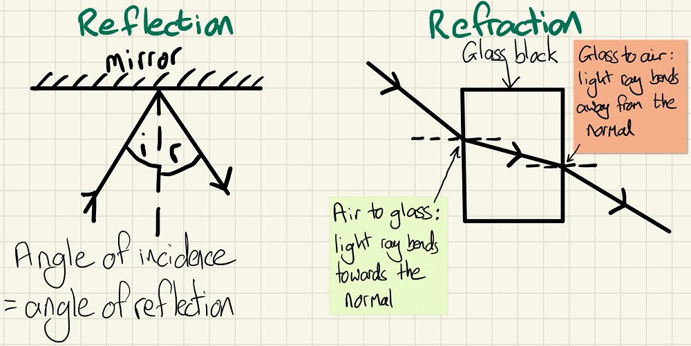 Use ray diagrams to show refraction when two different mediums meet (air to glass for example).