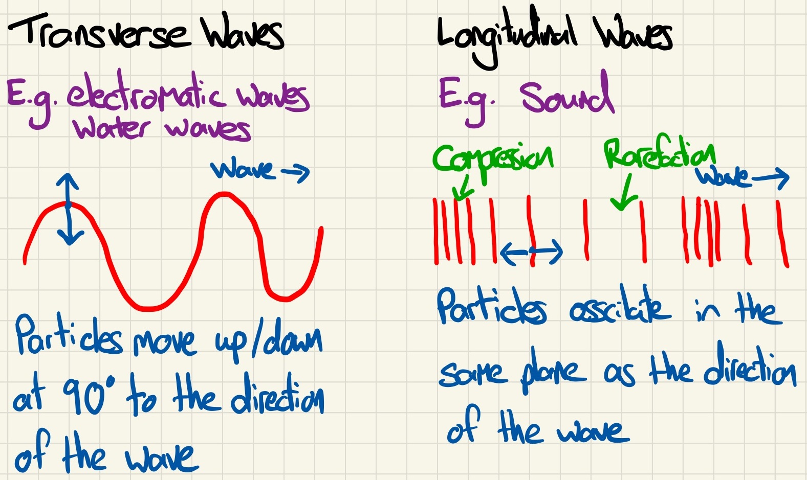 The two types of waves are: transverse (up and down like the sea) and longitudinal (areas of compression and rarefaction like sound in air). You need to be able to describe the differences and similarities. Make sure that you know that air particles to not travel from a person's mouth to your ear when you hear them and that ripples in a pond move from the centre to the edge but the water molecules simply bob up and down.